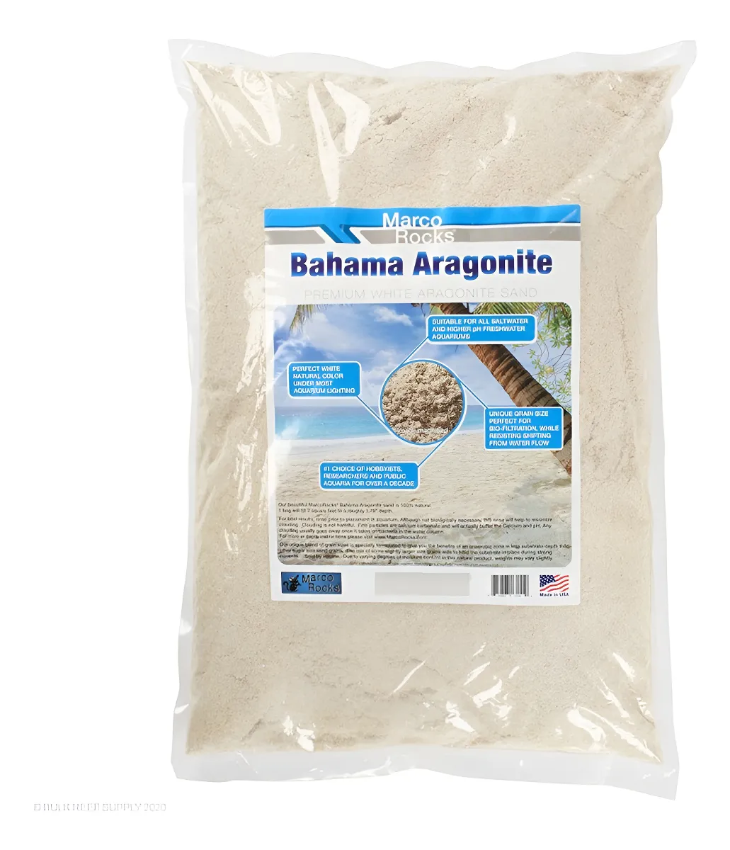 O objetivo com MarcoRocks Bahama Aragonite Sand era recriar o que você normalmente encontraria no chão de um recife de coral. É 100% natural e dará uma bela cor de areia branca natural sob a maioria da iluminação do aquário. O tamanho variável do grão da areia das Bahamas contém pequenas partículas, criando uma grande área de superfície para filtração biológica, enquanto inclui partículas maiores que resistem ao deslocamento e ao sopro na maioria das condições de fluxo de água. As pequenas partículas ajudam a areia a criar zonas anaeróbicas no leito de areia em menos profundidade do que outras misturas do tamanho de açúcar e os grãos maiores ajudarão a manter as pequenas partículas no lugar durante correntes mais fortes.