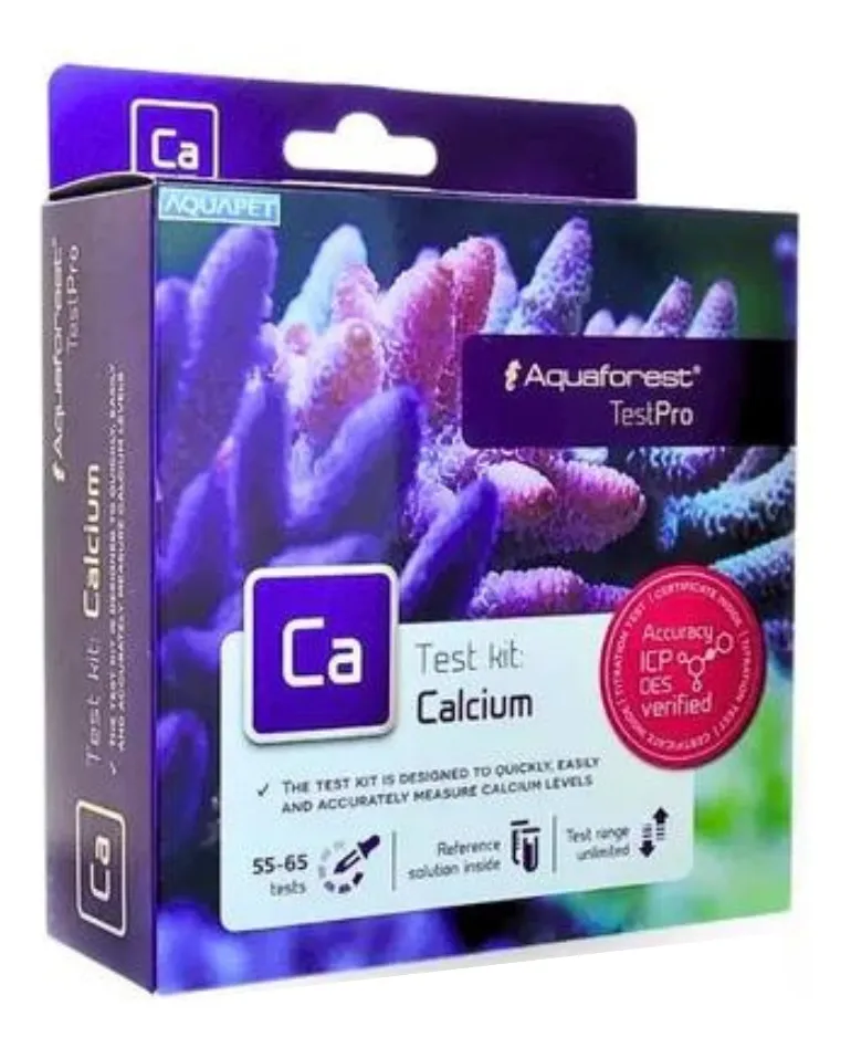 Aquaforest TestPro Calcium é desenhado para medir rapidamente a concentração de cálcio na água salgada. O cálcio desempenha um papel importante em muitos processos biológicos, e participa na construção do esqueleto de carbonato de cálcio dos corais duros. Os níveis de cálcio devem ser analisados regularmente, juntamente com outros parâmetros críticos da água, como Alcalinidade e Magnésio. O nível de cálcio recomendado deve ser mantido entre os 400-450 mg / l (ppm). O kit de teste contém reagentes suficientes para realizar aproximadamente 55-60 testes, dentro do intervalo de valores recomendado.